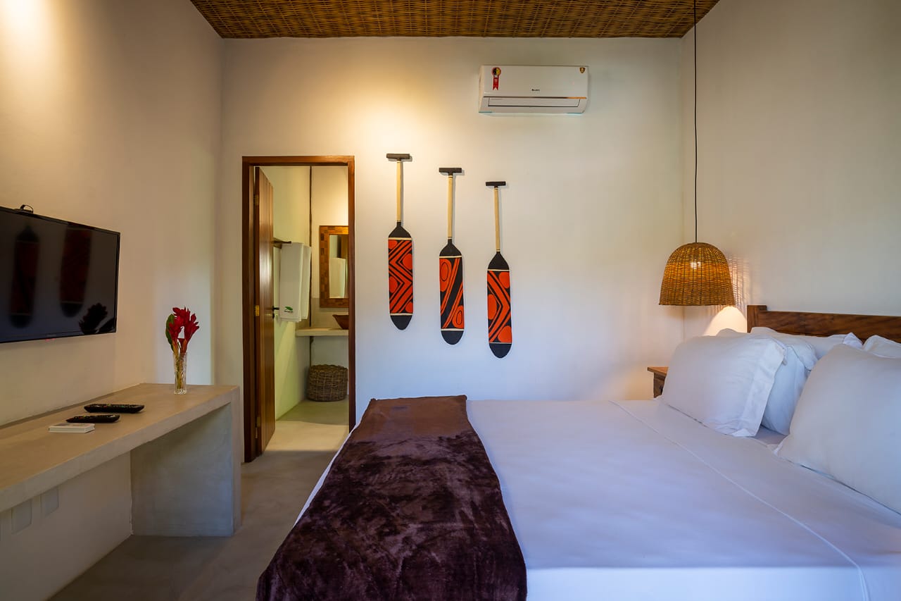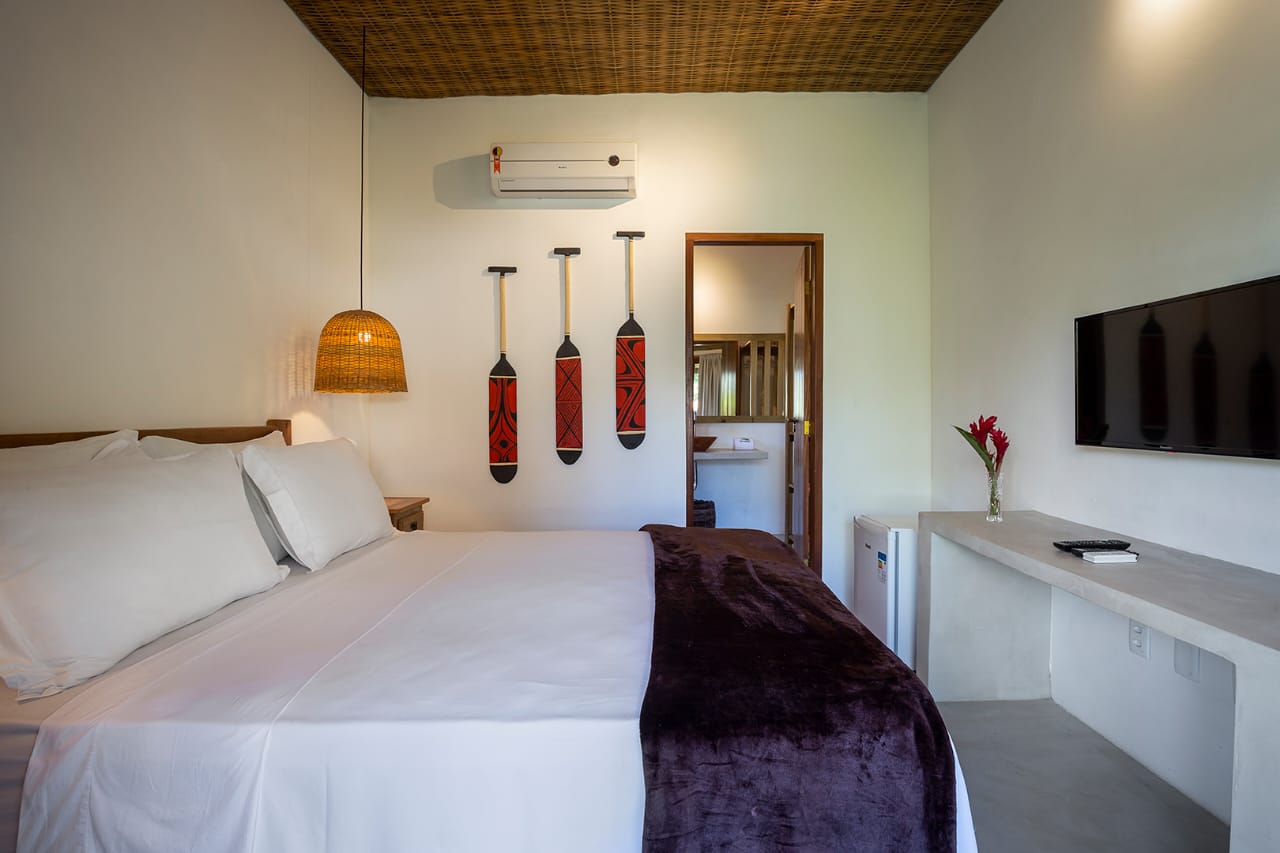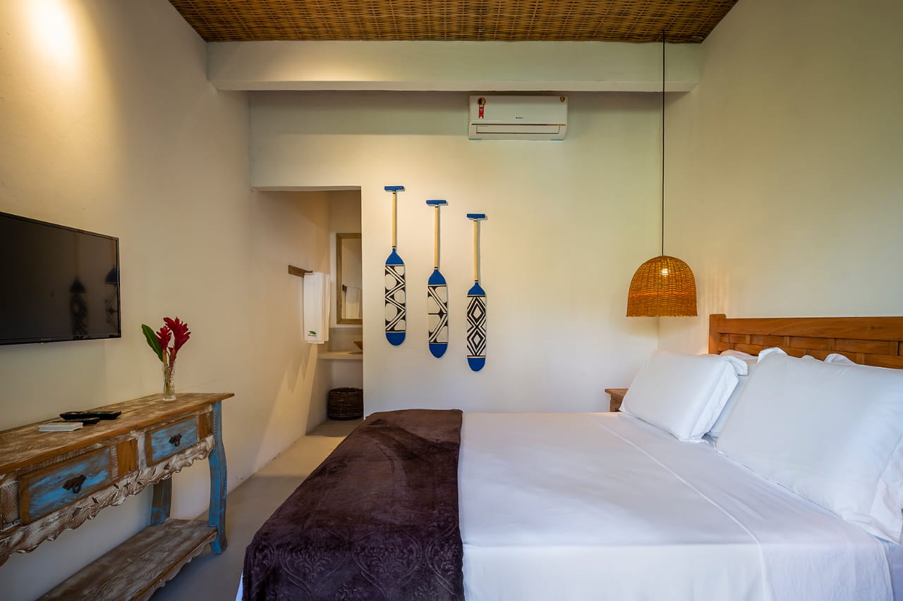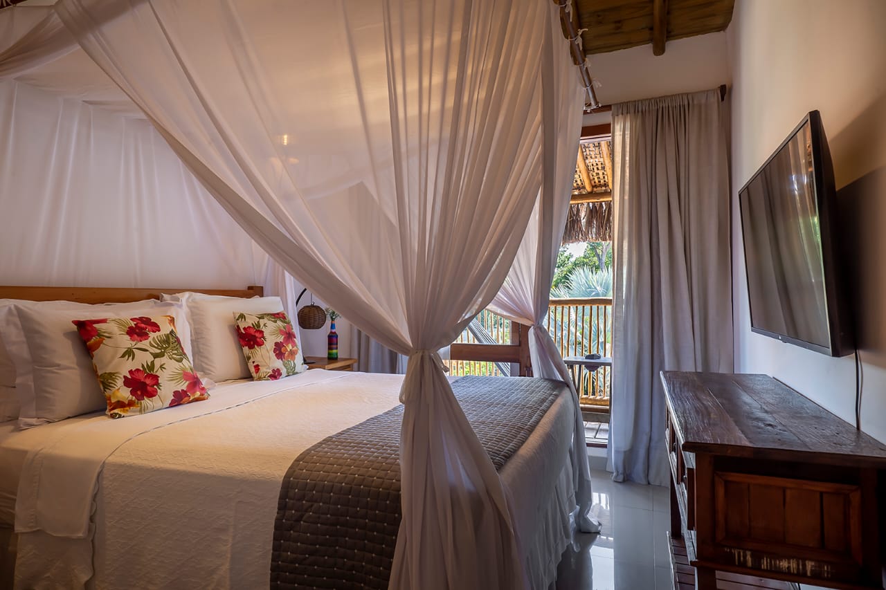 - Suíte 4: Cama Queen com mosquiteiro, criado-mudo e TV (parte anexa da casa)