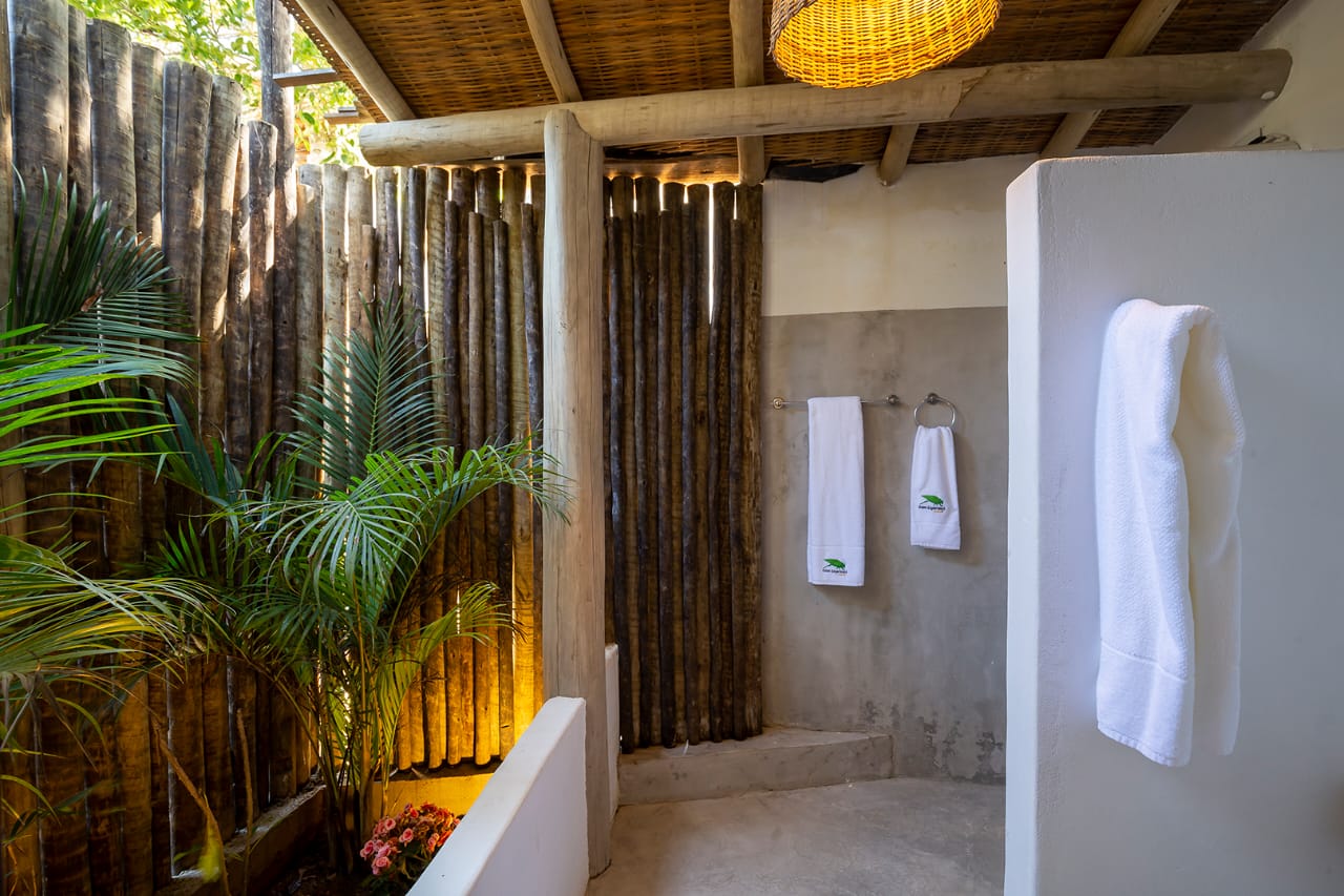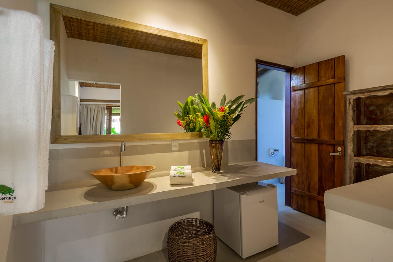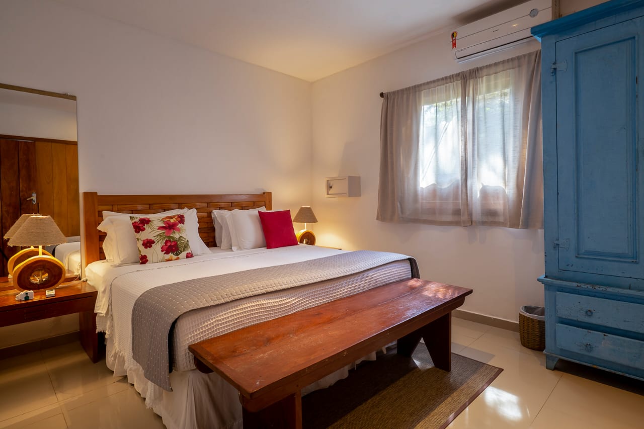 - Quarto 6: Cama Queen com mosquiteiro e criado-mudo (parte superior, banheiro ao lado)