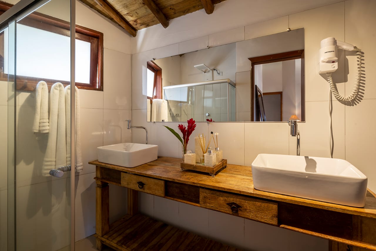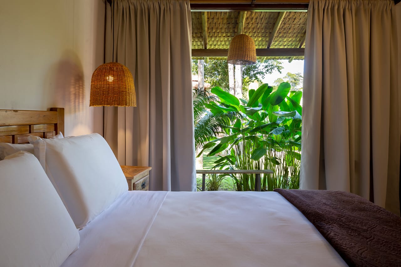 - Quarto 7: Cama Queen com mosquiteiro e criado-mudo (parte superior, banheiro ao lado)