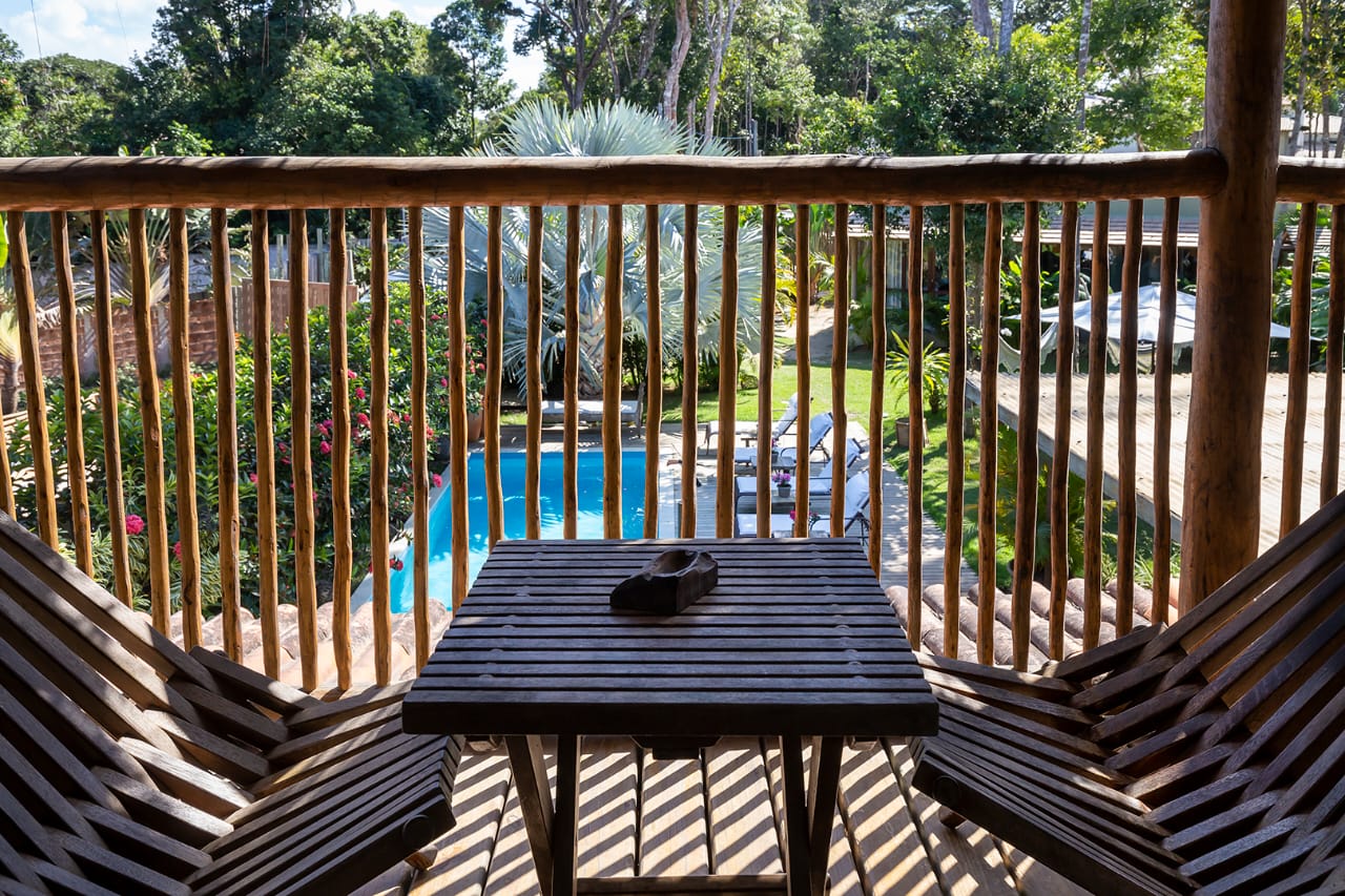 - Suíte 1: Cama Queen com dossel, TV, armário, criado-mudo e varanda individual (parte superior)