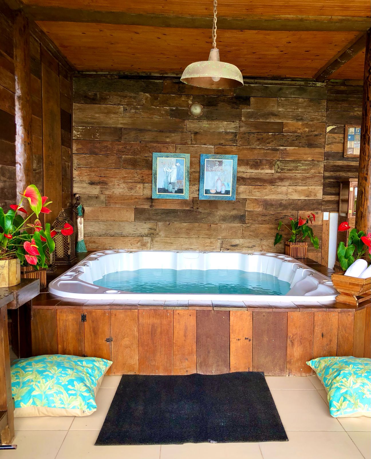 • Deck rústico com jacuzzi/spa para até 7 pessoas.