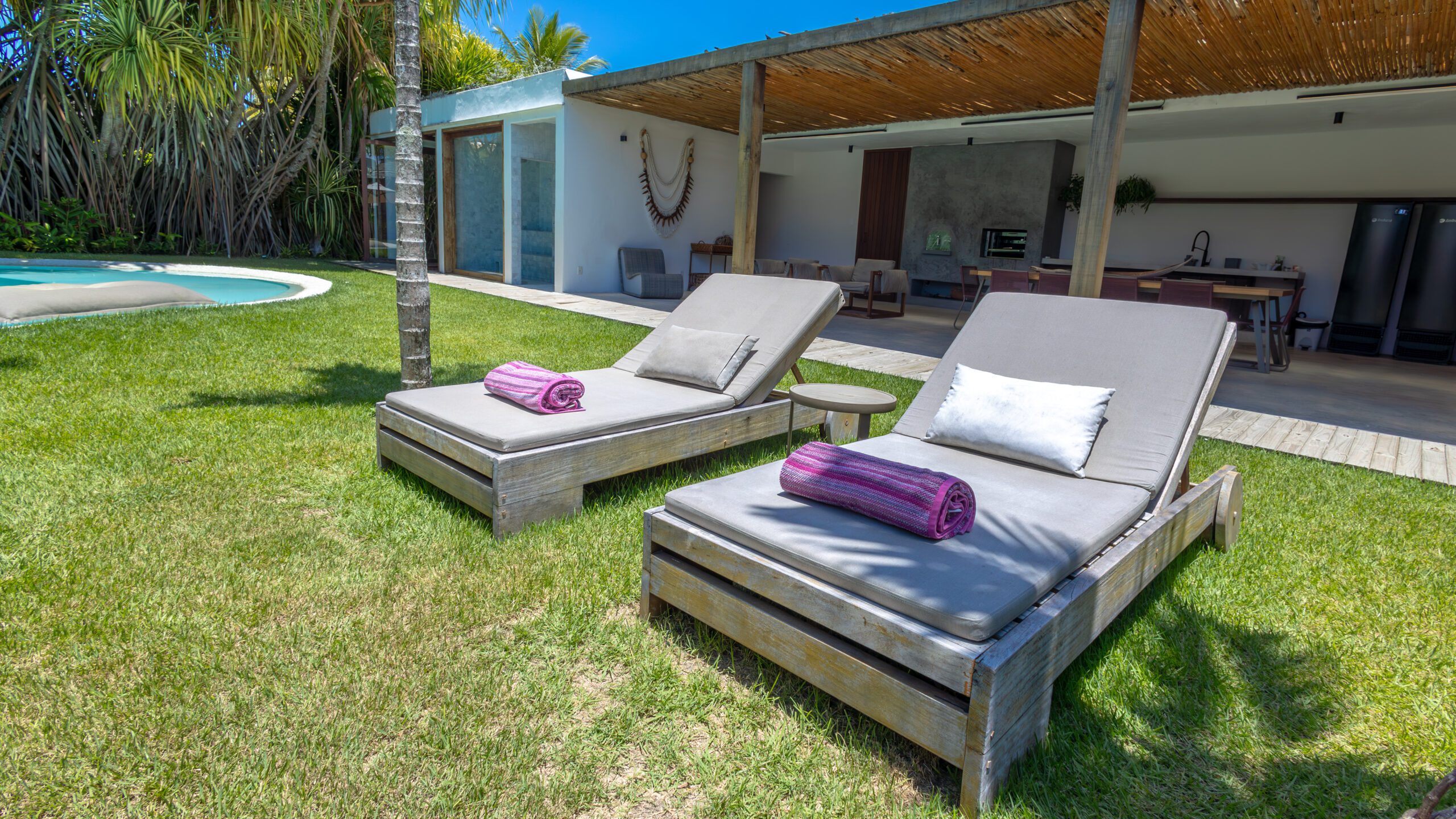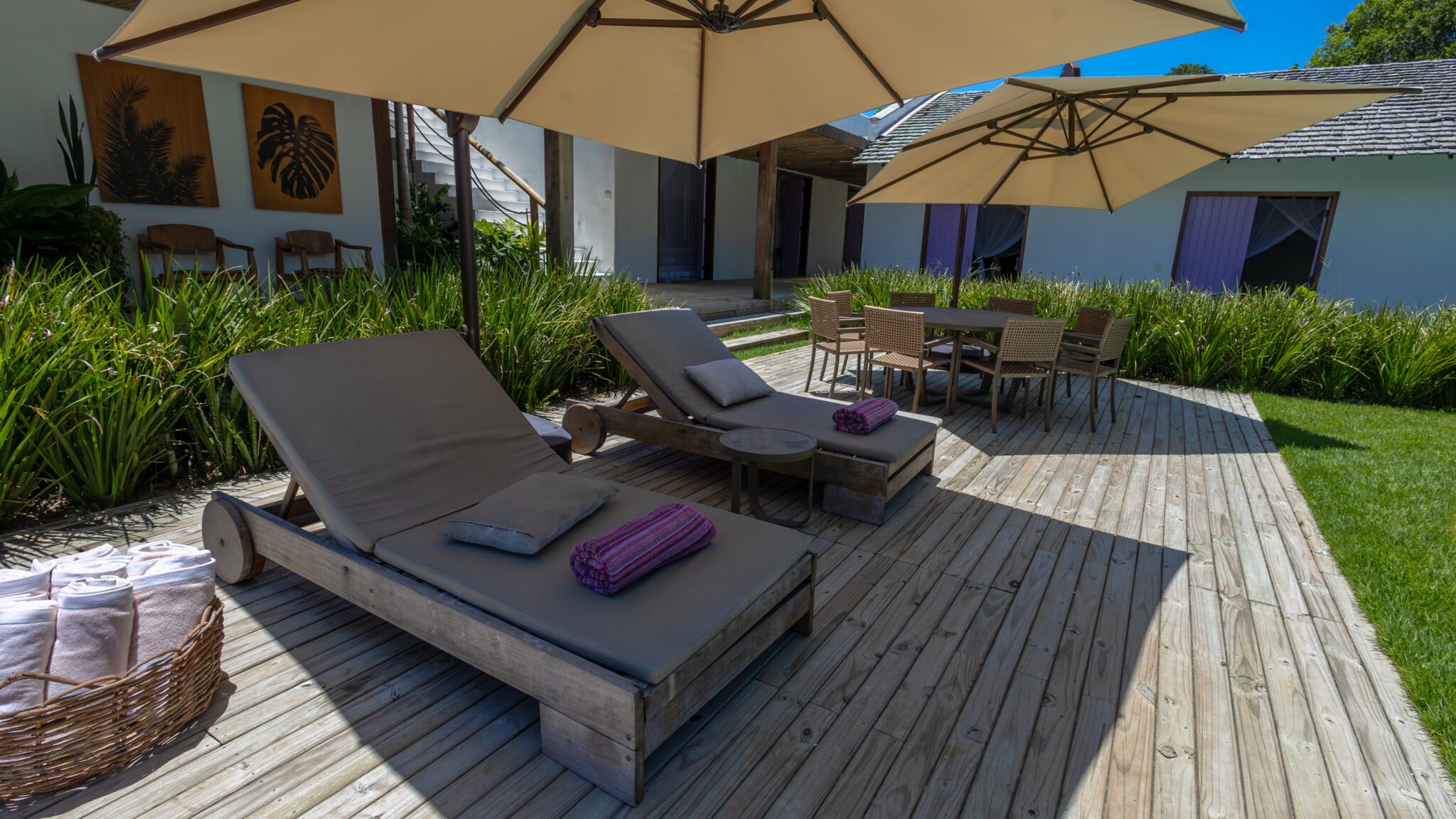• Deck com espreguiçadeiras, ombrelones e almofadões.