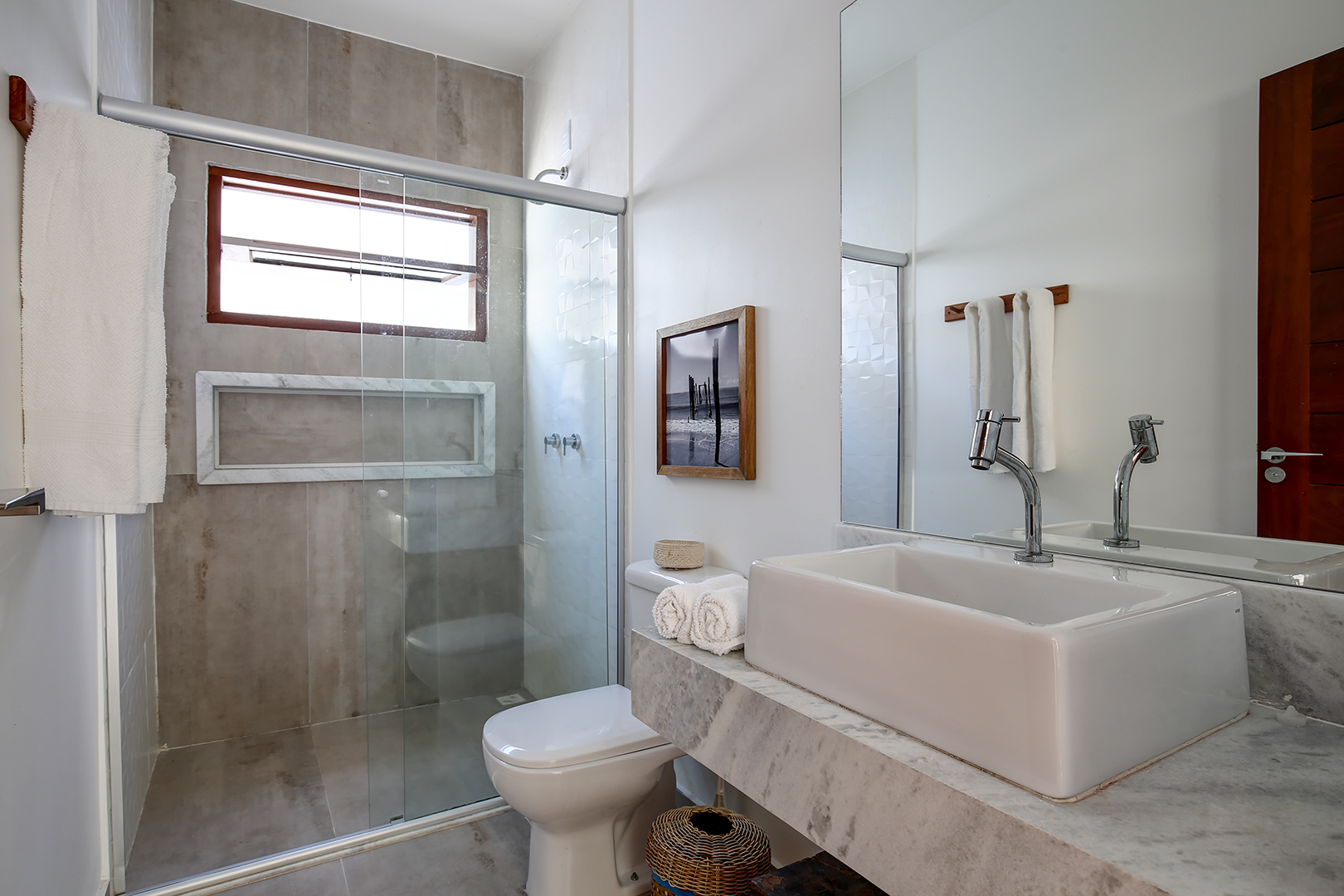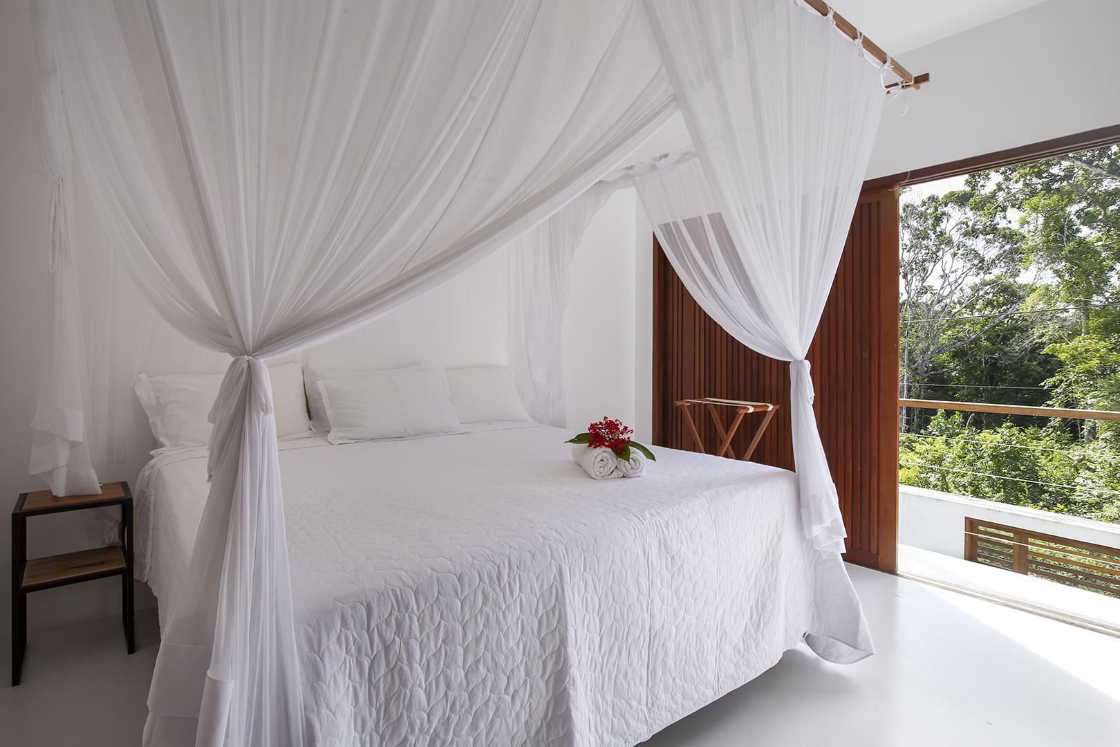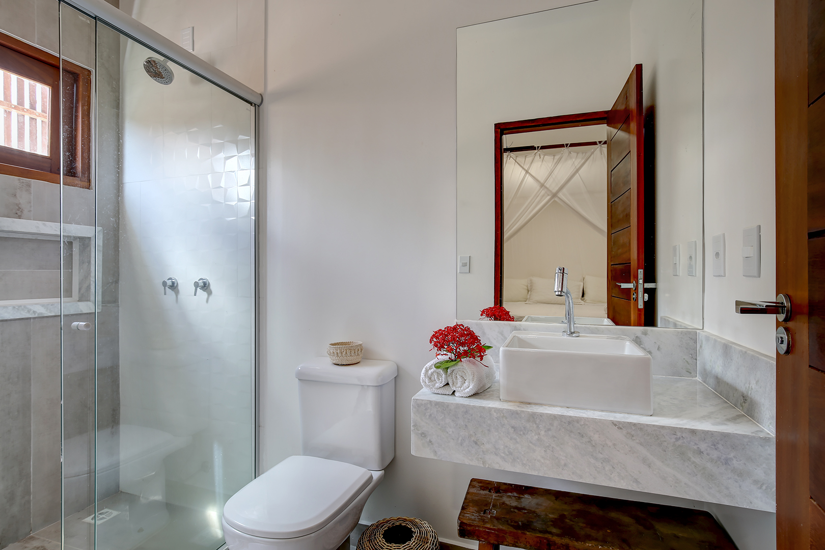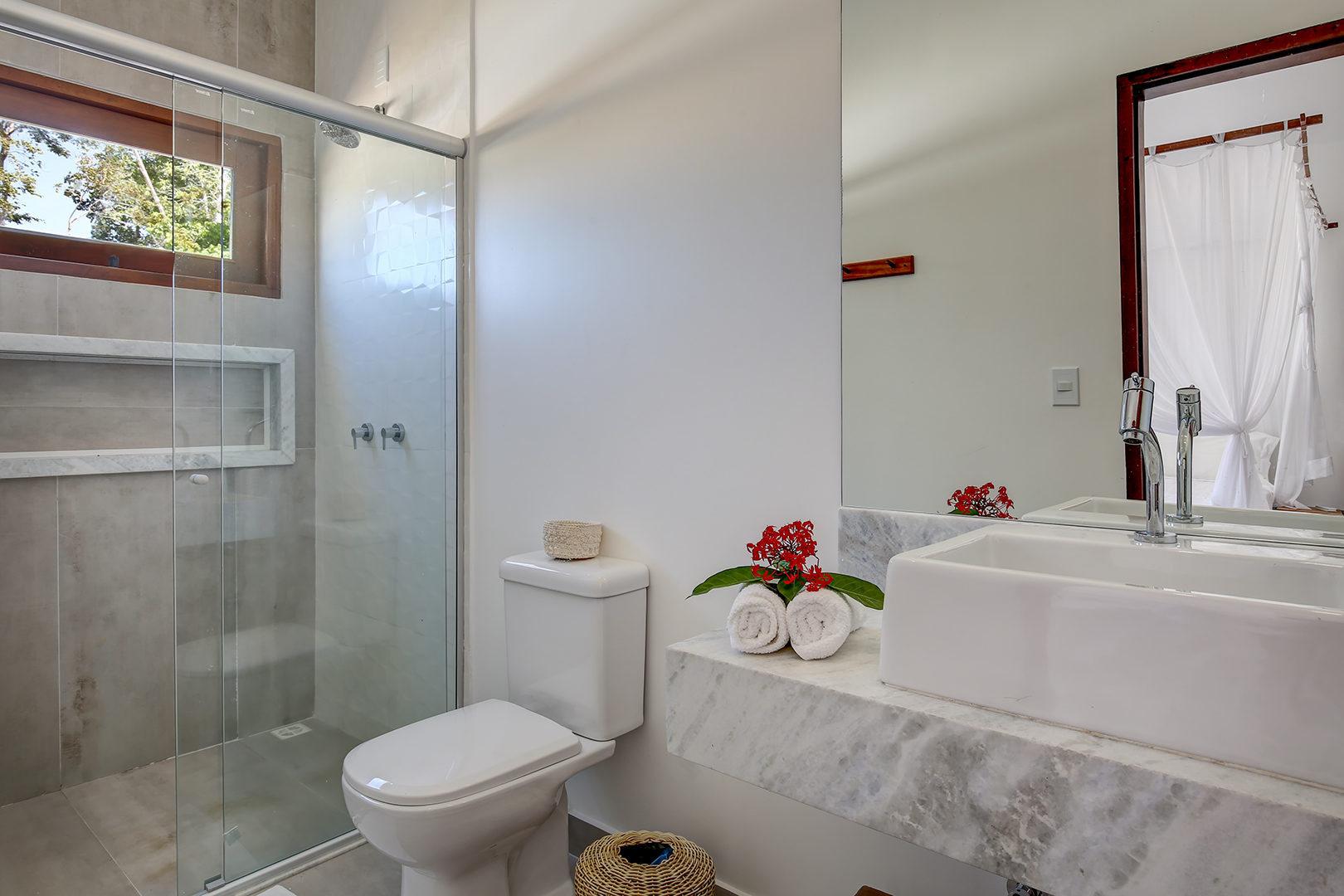 As suítes possuem camas configuráveis (casal ou solteiro), que podem ser ajustadas conforme a solicitação do hóspede até 5 dias antes do check-in. O banheiro externo completo serve o quinto dormitório, que acomoda até 4 pessoas.