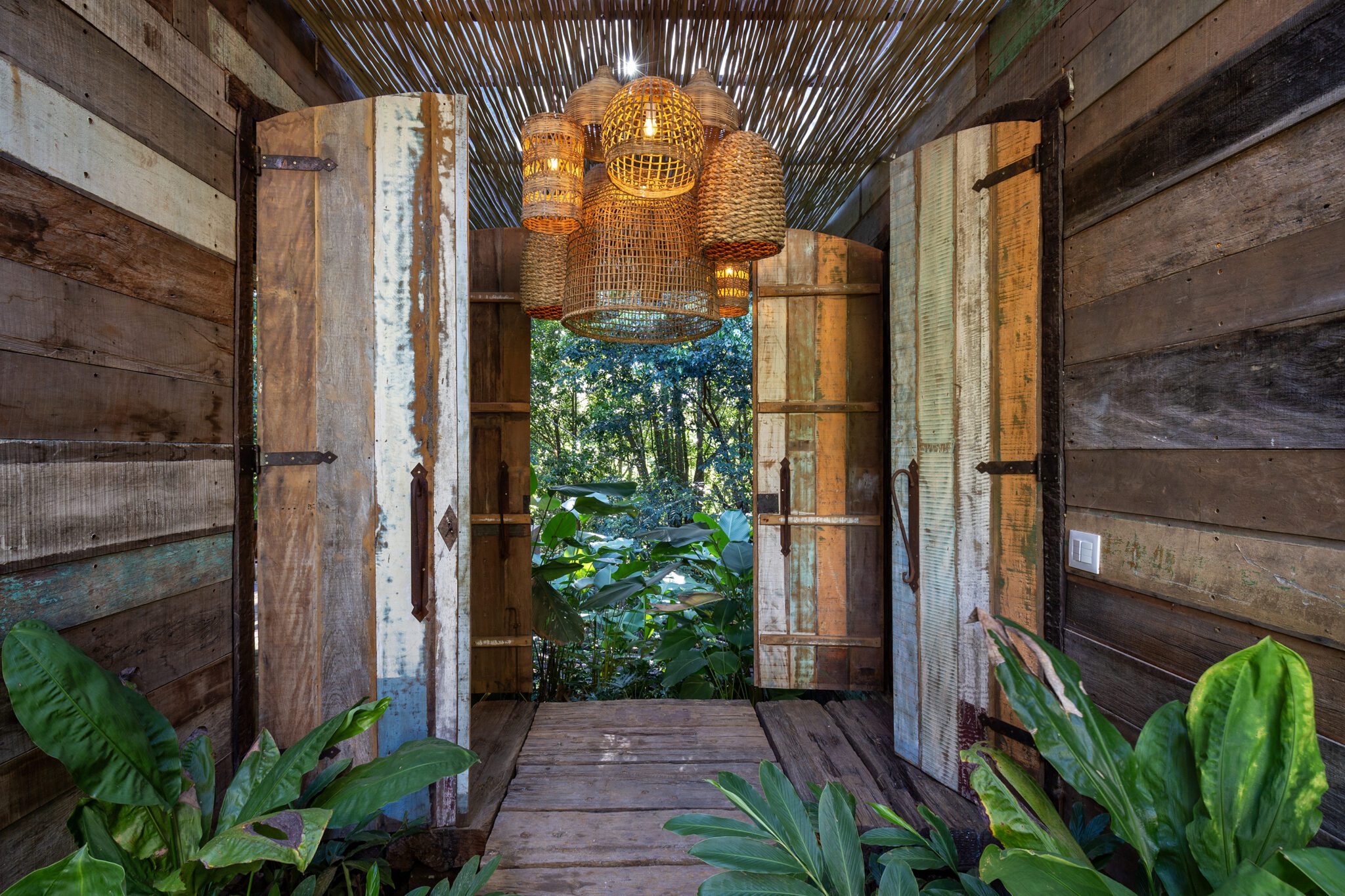 - 3 suítes no bloco de hóspedes com configurações variadas, incluindo bicamas, varanda e vista para o jardim ou mata