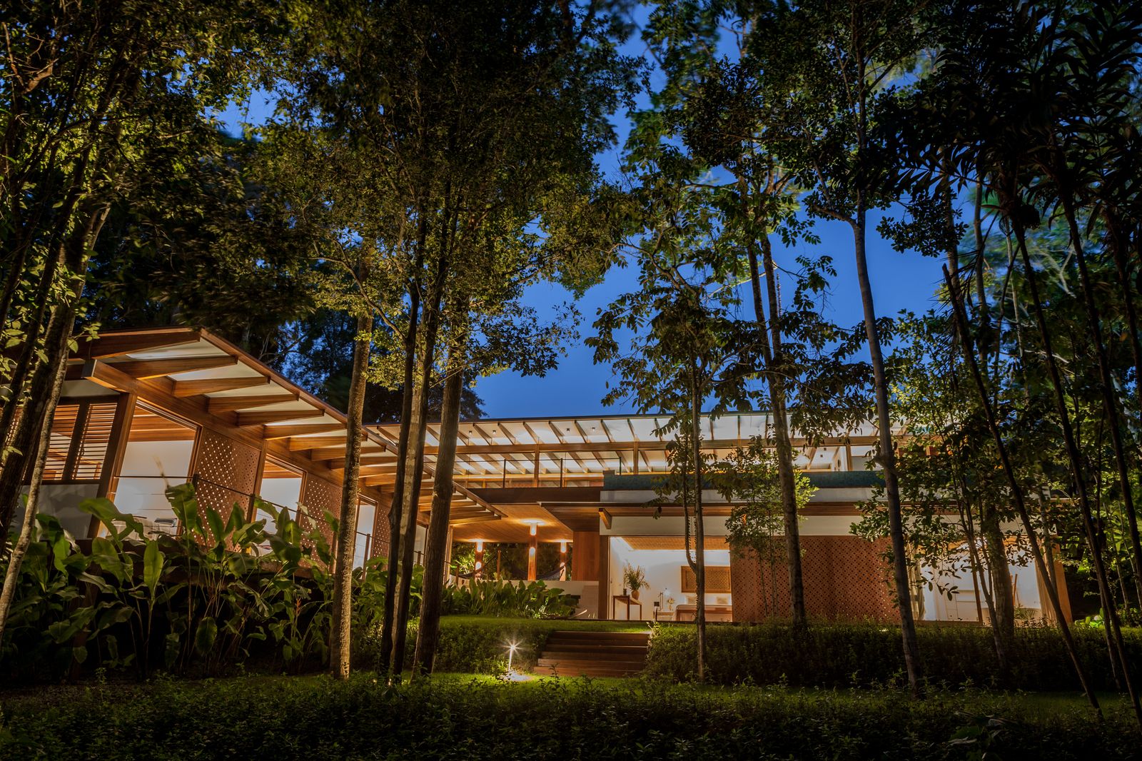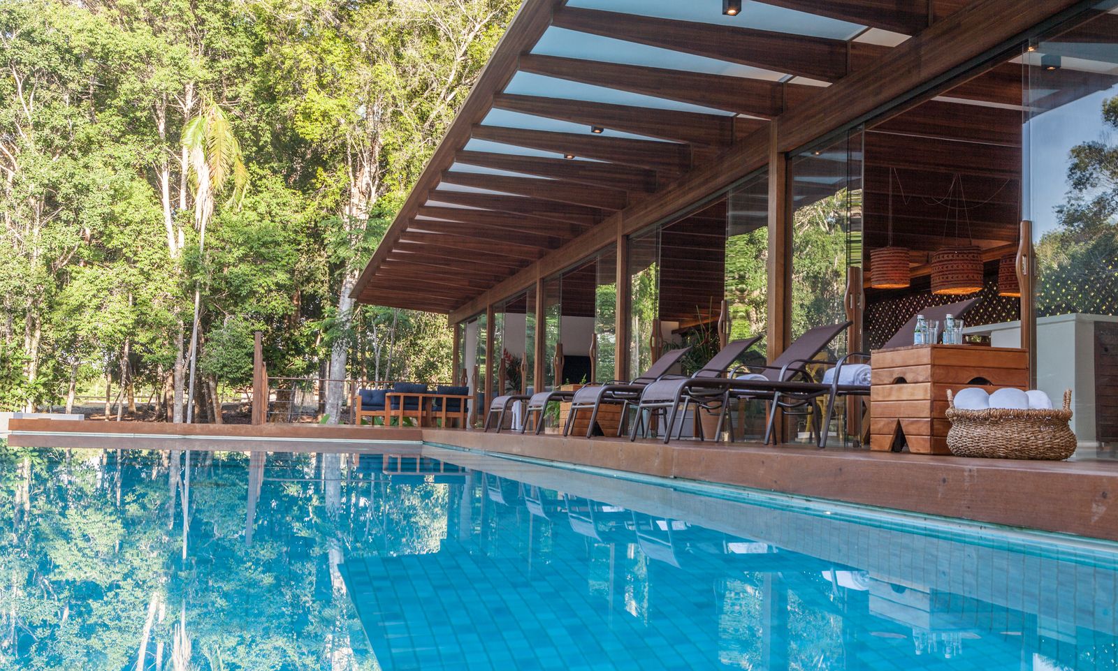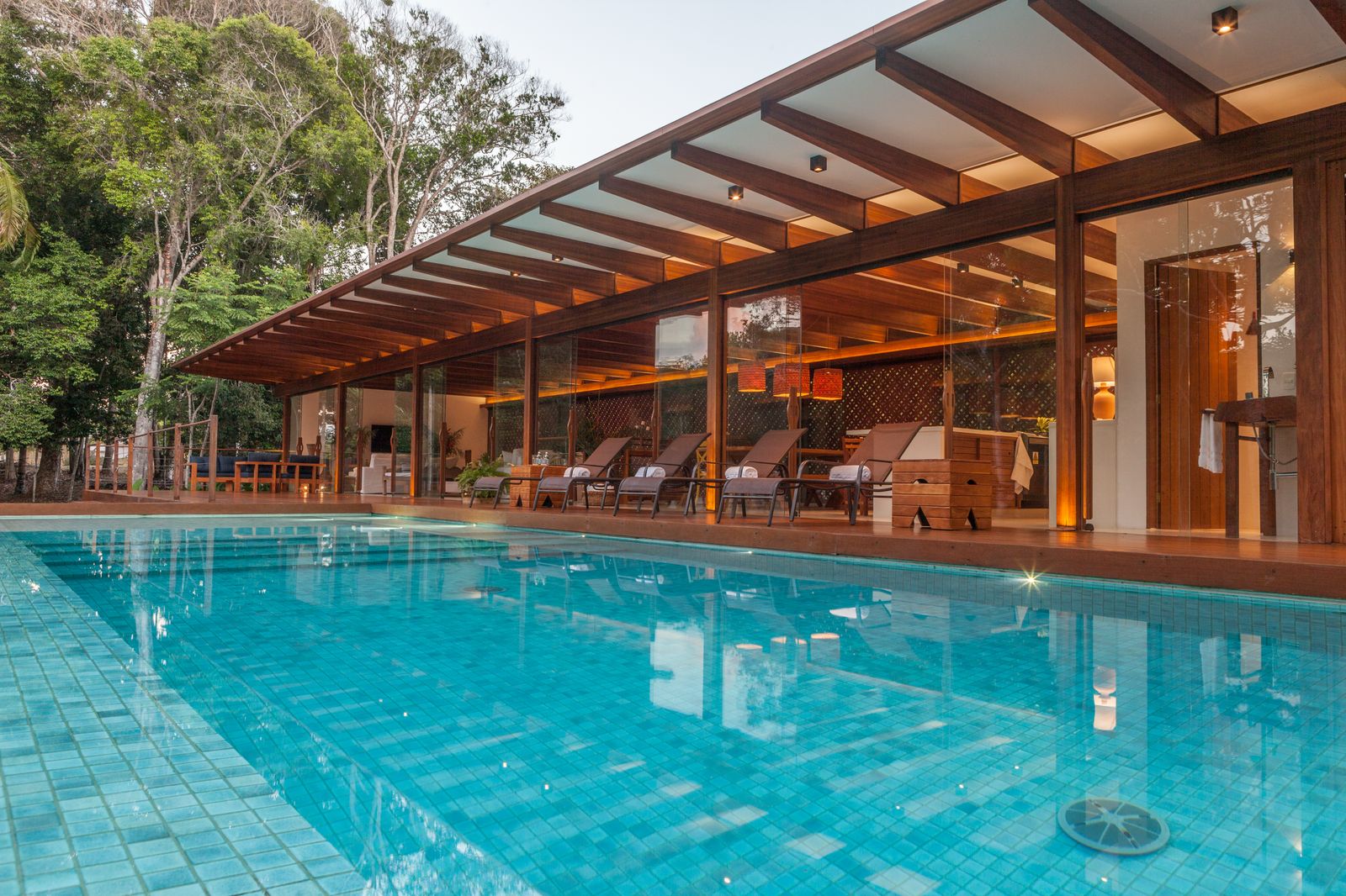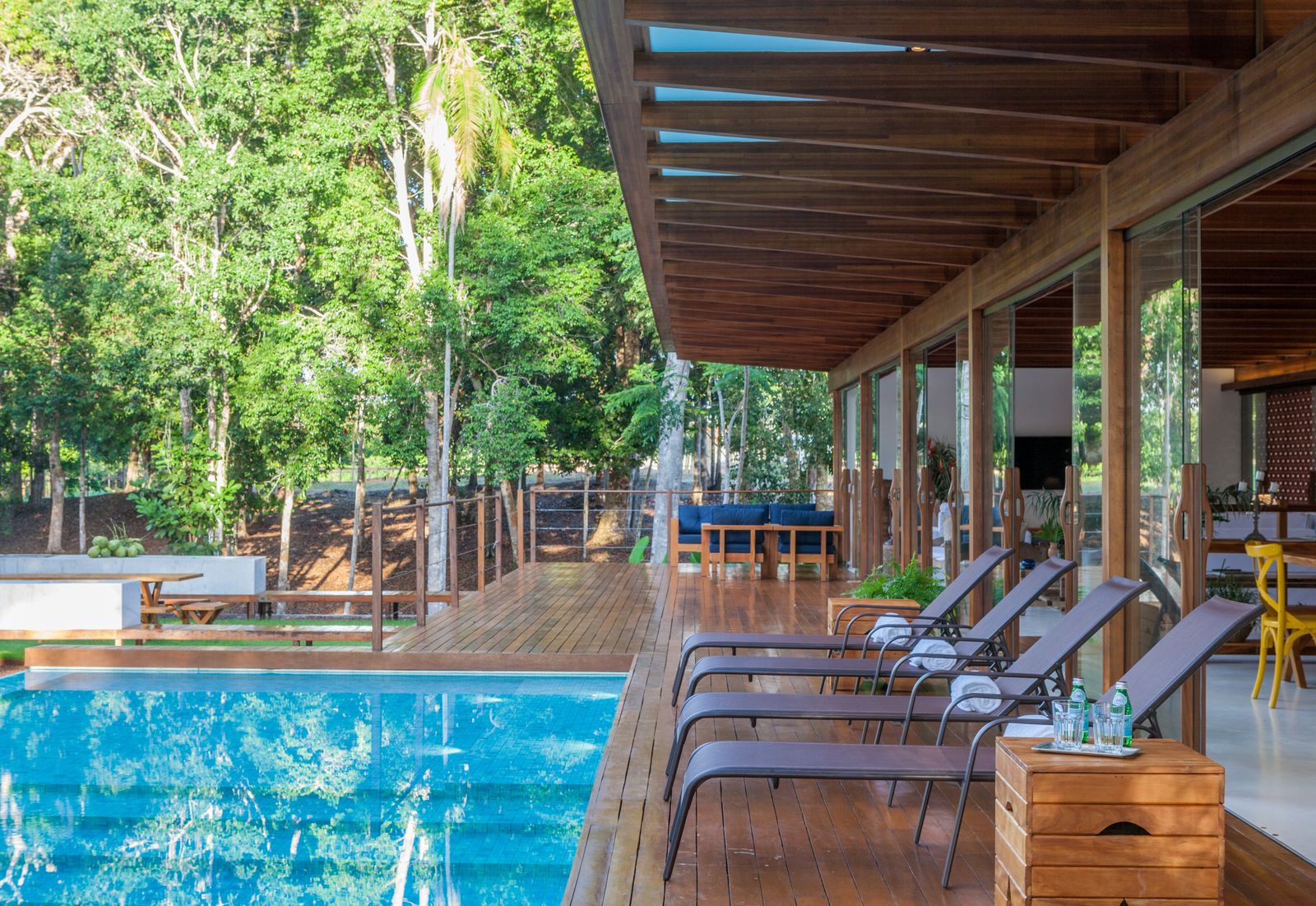 - Bloco principal com piscina de borda infinita com vista para a copa das árvores