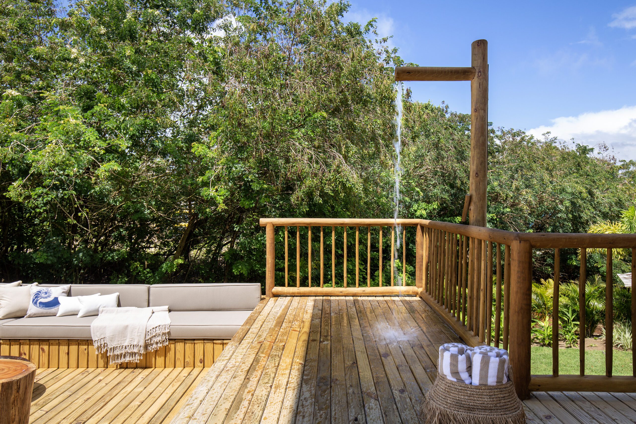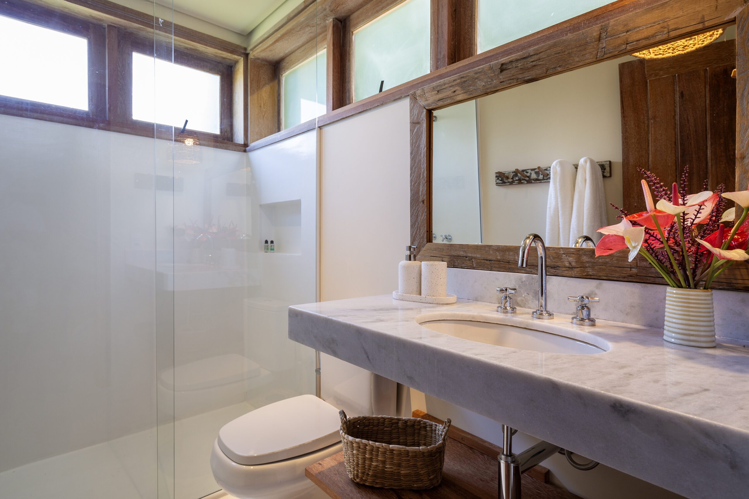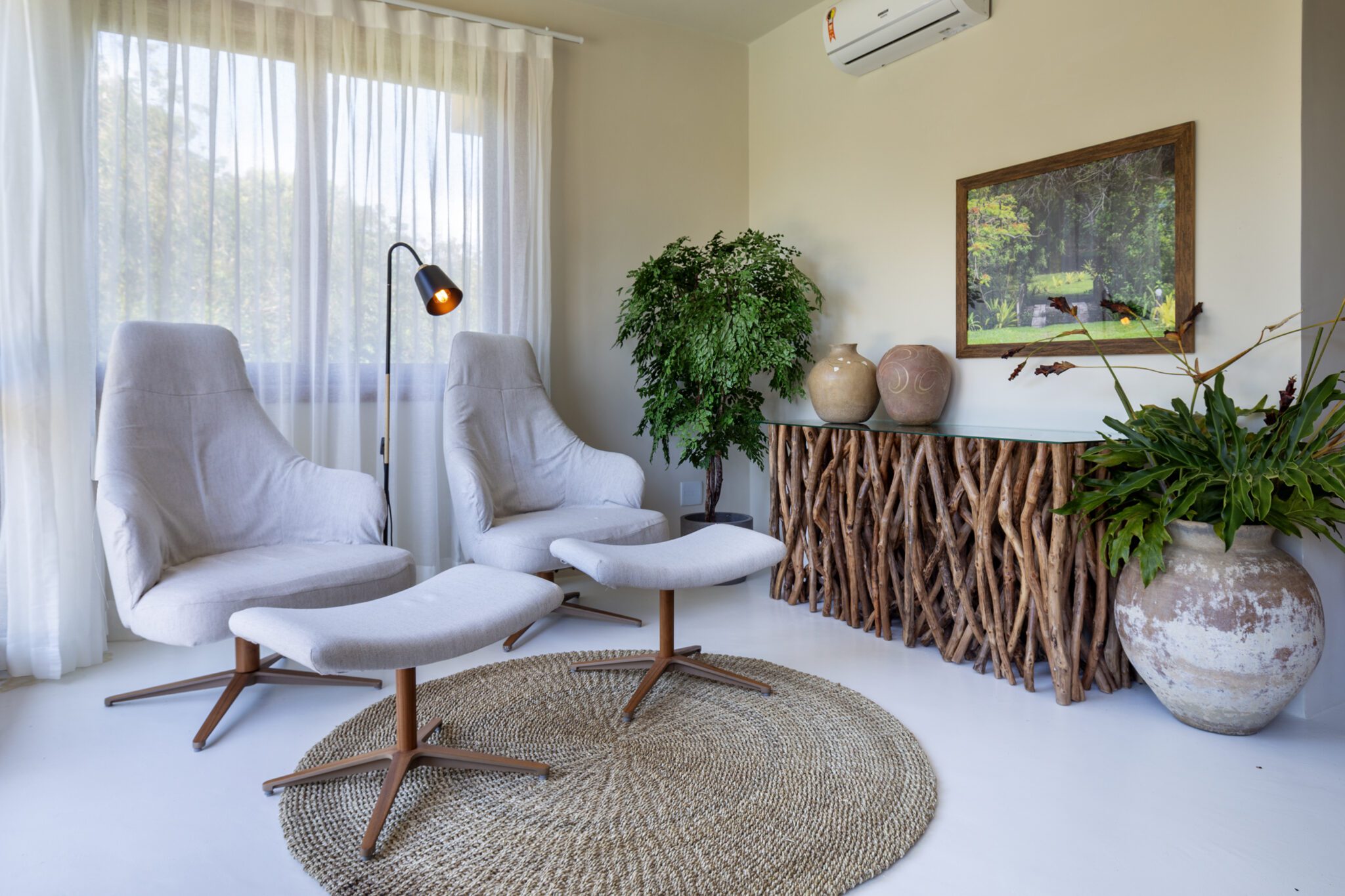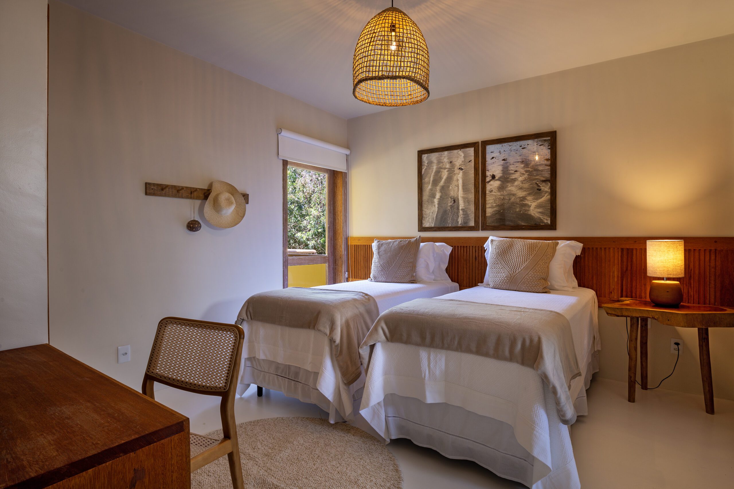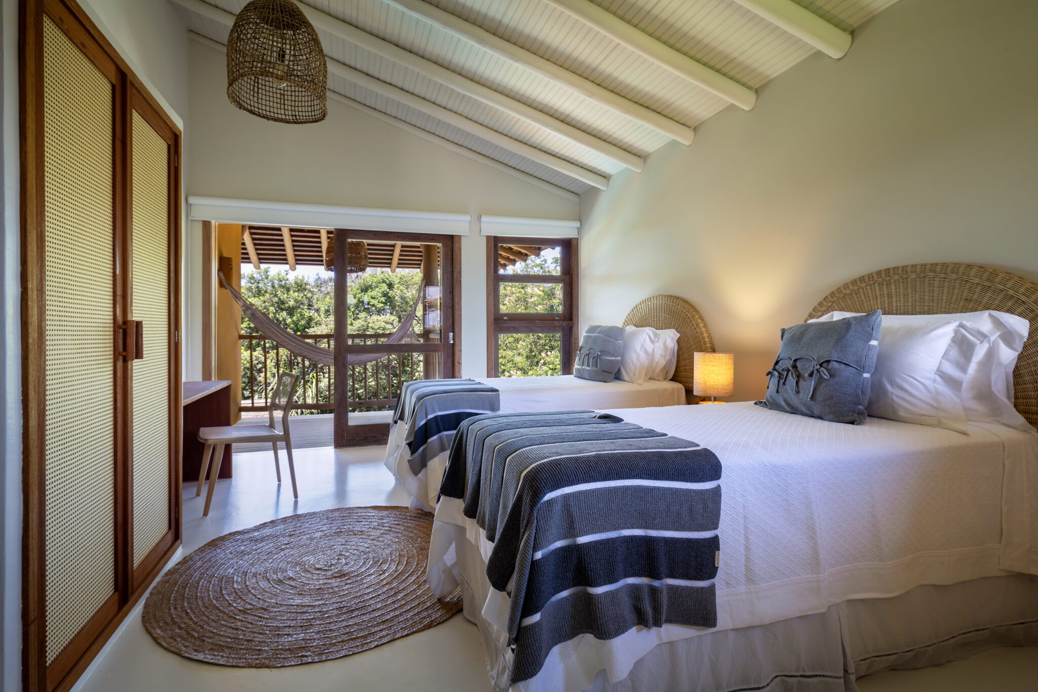- Suíte 02 (Superior): 2 camas de solteiro, varanda com vista para o jardim e piscina, secador de cabelo