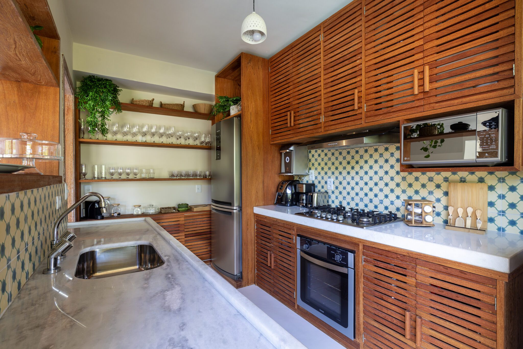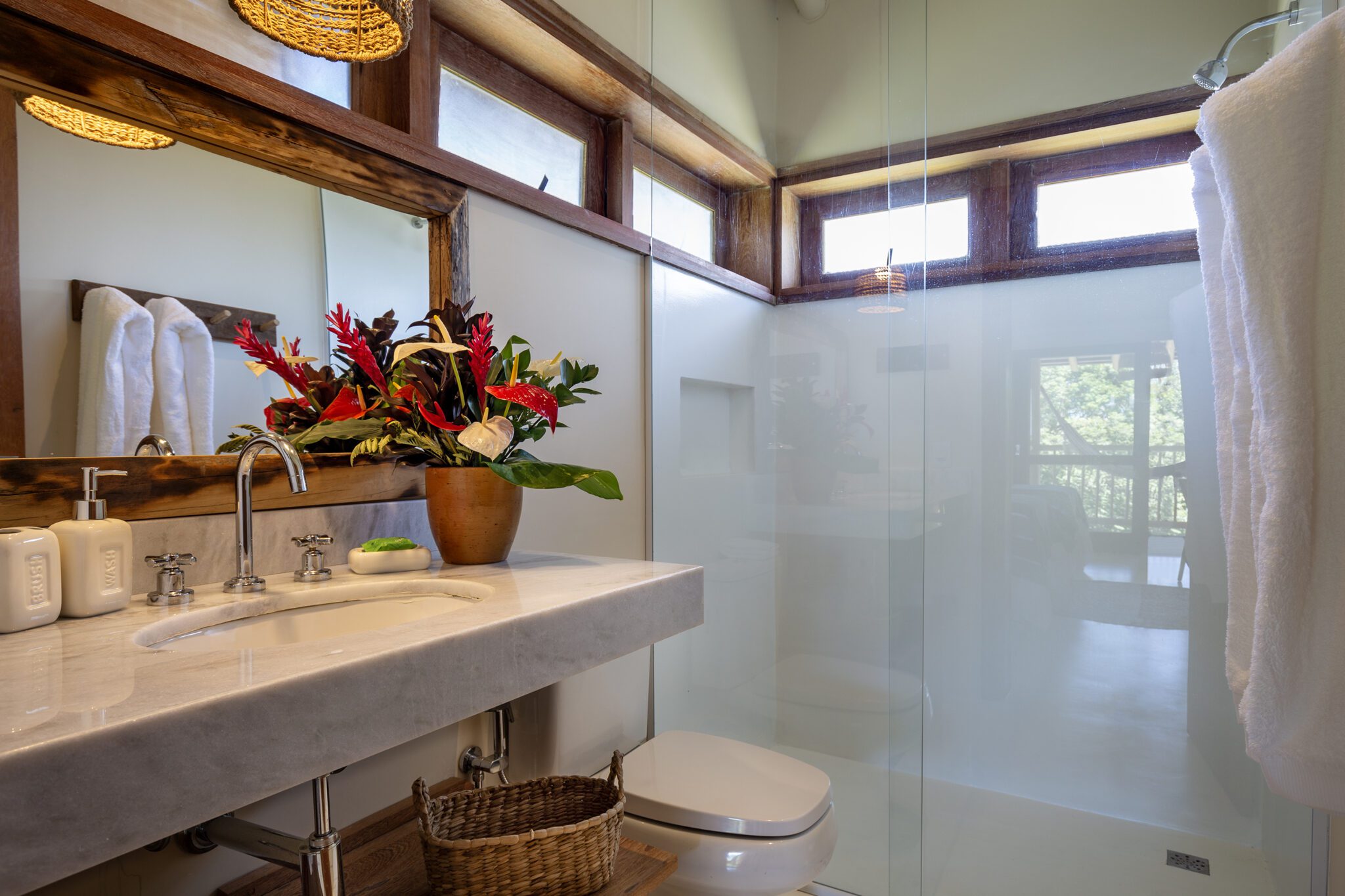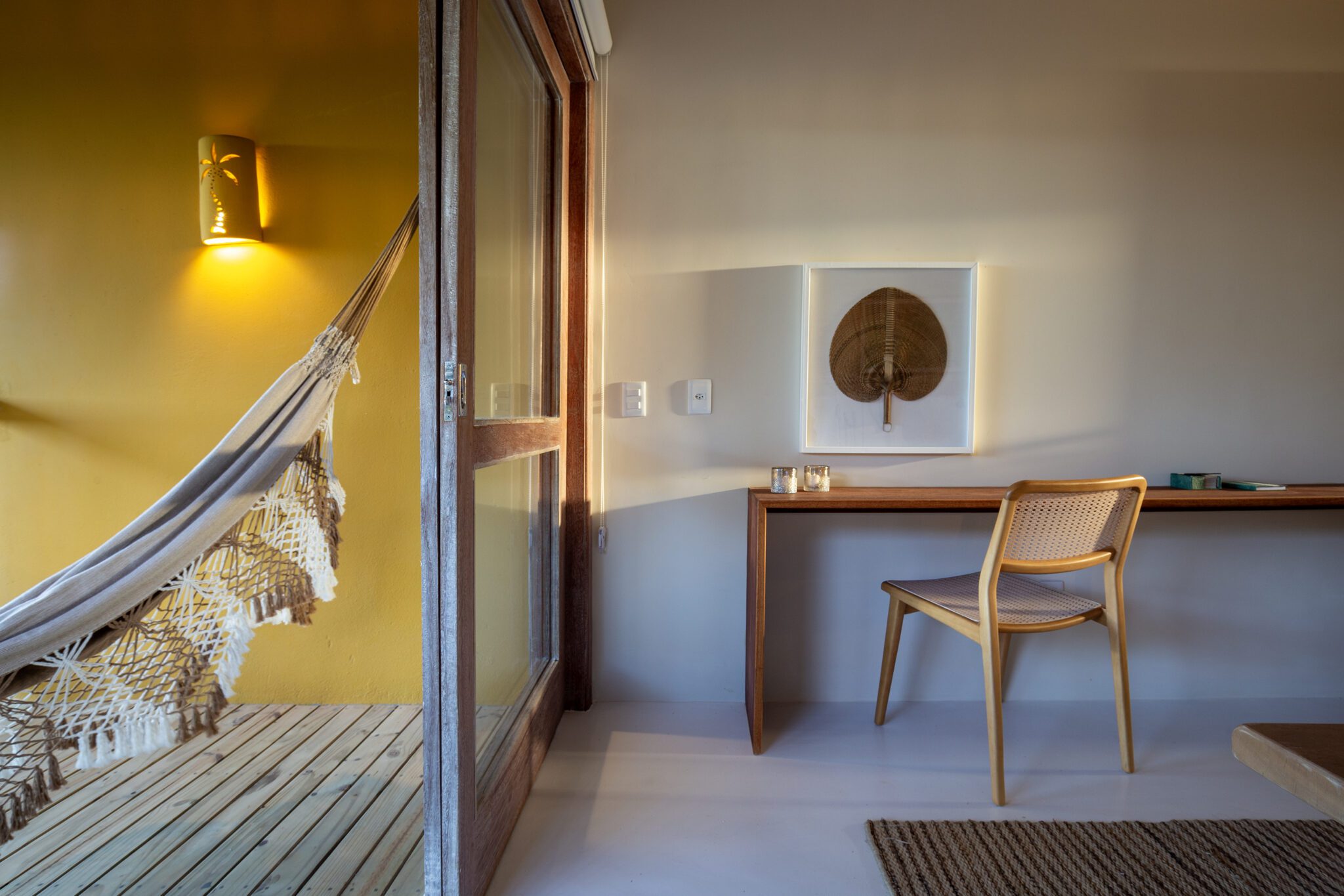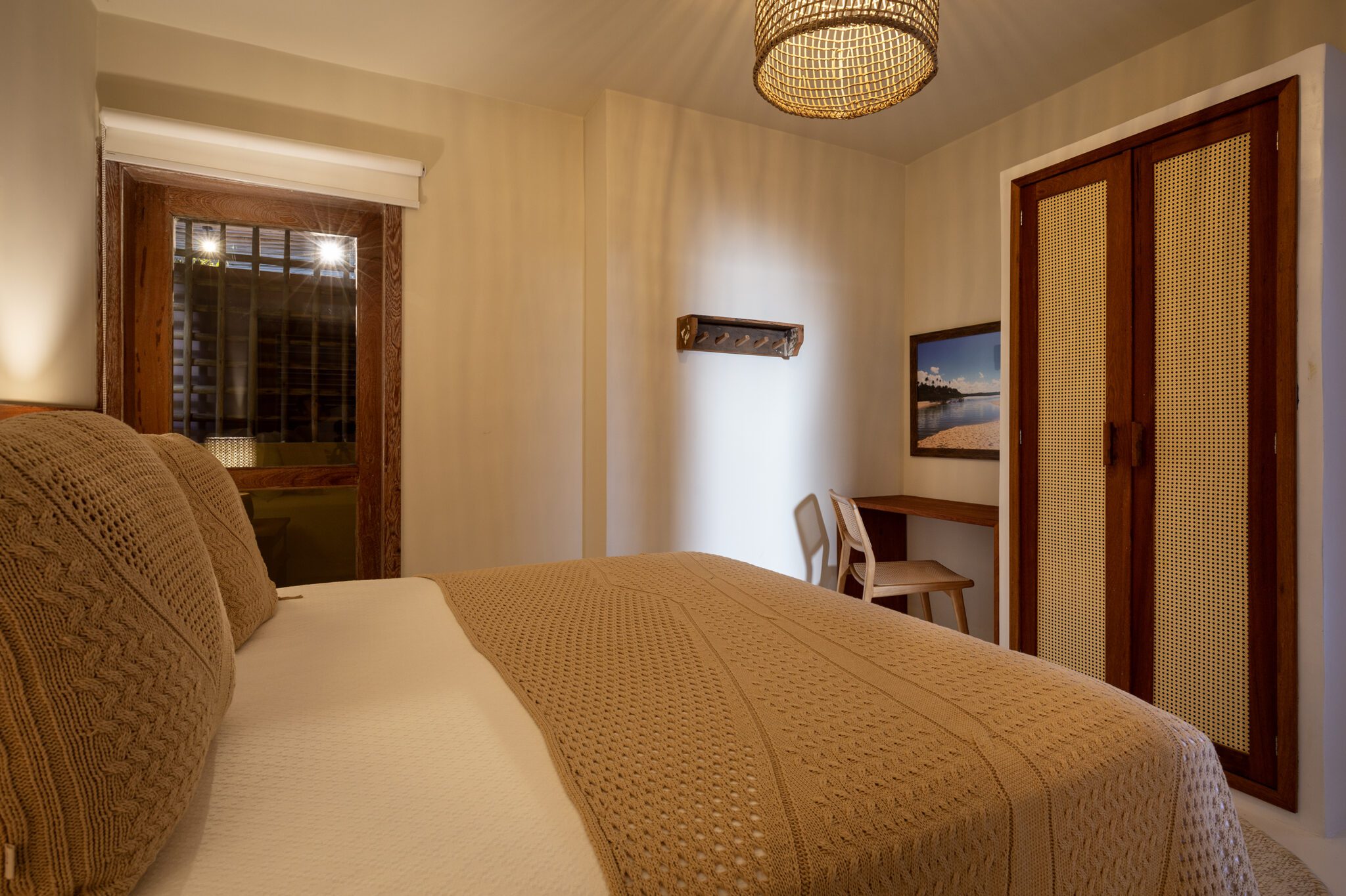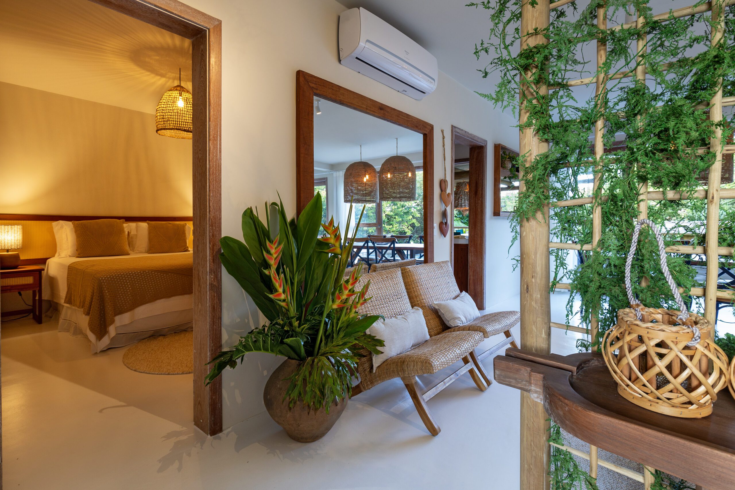 - Suíte 01 (Superior): Cama king size, closet, cofre, secador de cabelo, varanda com vista para o jardim e piscina